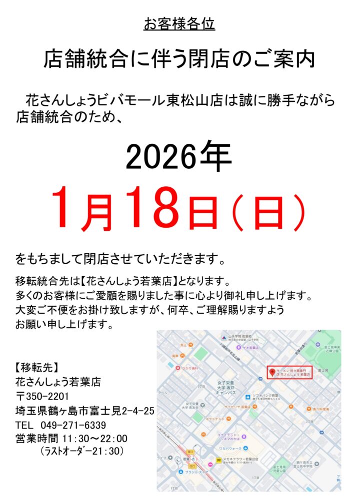 花さんしょうビバモール東松山店は誠に勝手ながら