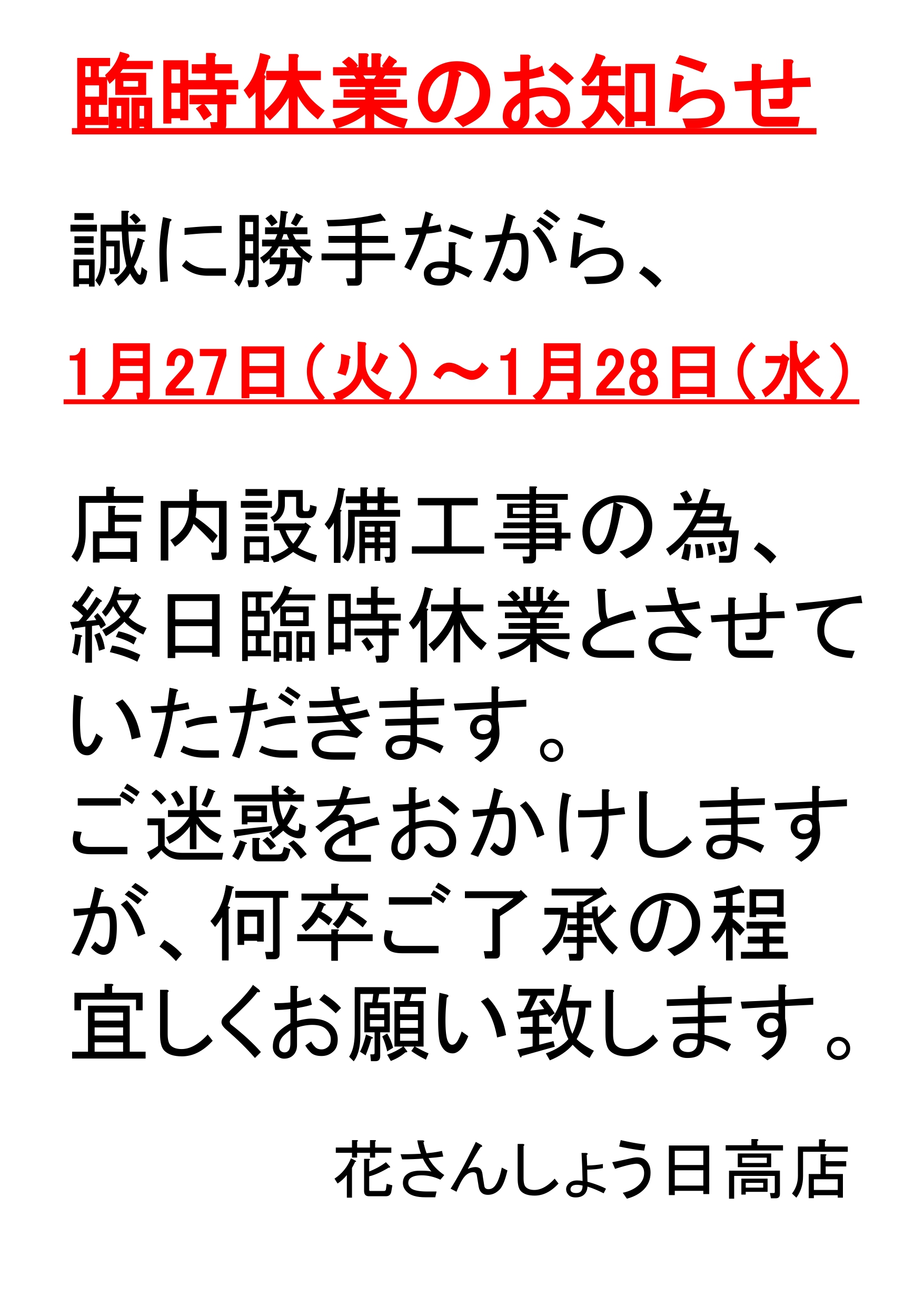 日高店臨時休業のお知らせ